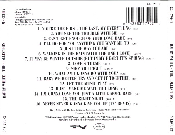 | 141 | BARRY WHITE | 71 | THE COLLECTION | 141.jpg | 141R.jpg | MERCURY | 1988 | originale |