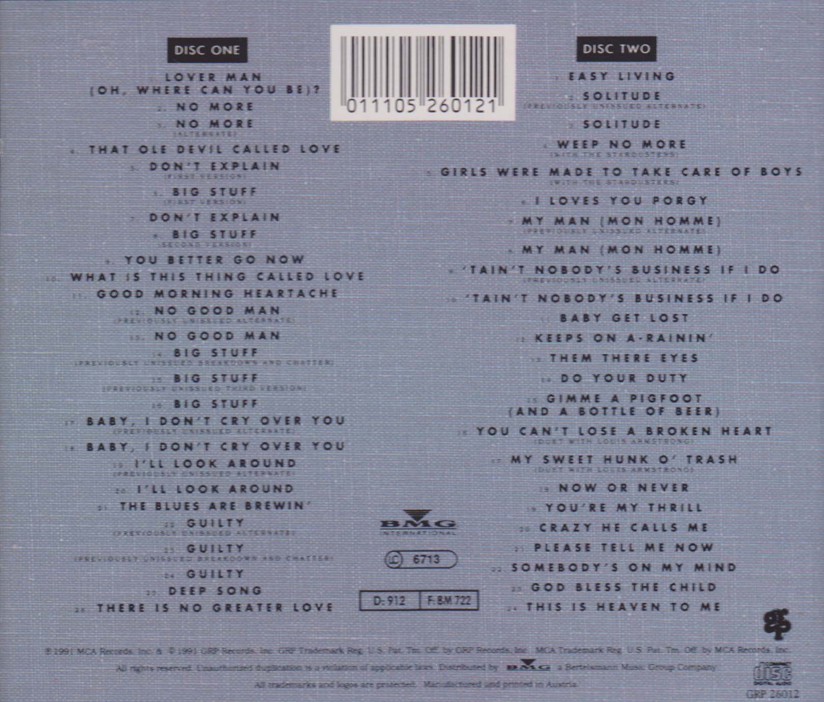 | 328 | BILLIE HOLIDAY | 164 | THE COMPLETE ORIGINAL AMERICAN DECCA RECORDINGS | 328.jpg | 328R.jpg | GRP RECORD | 1991 | originale |