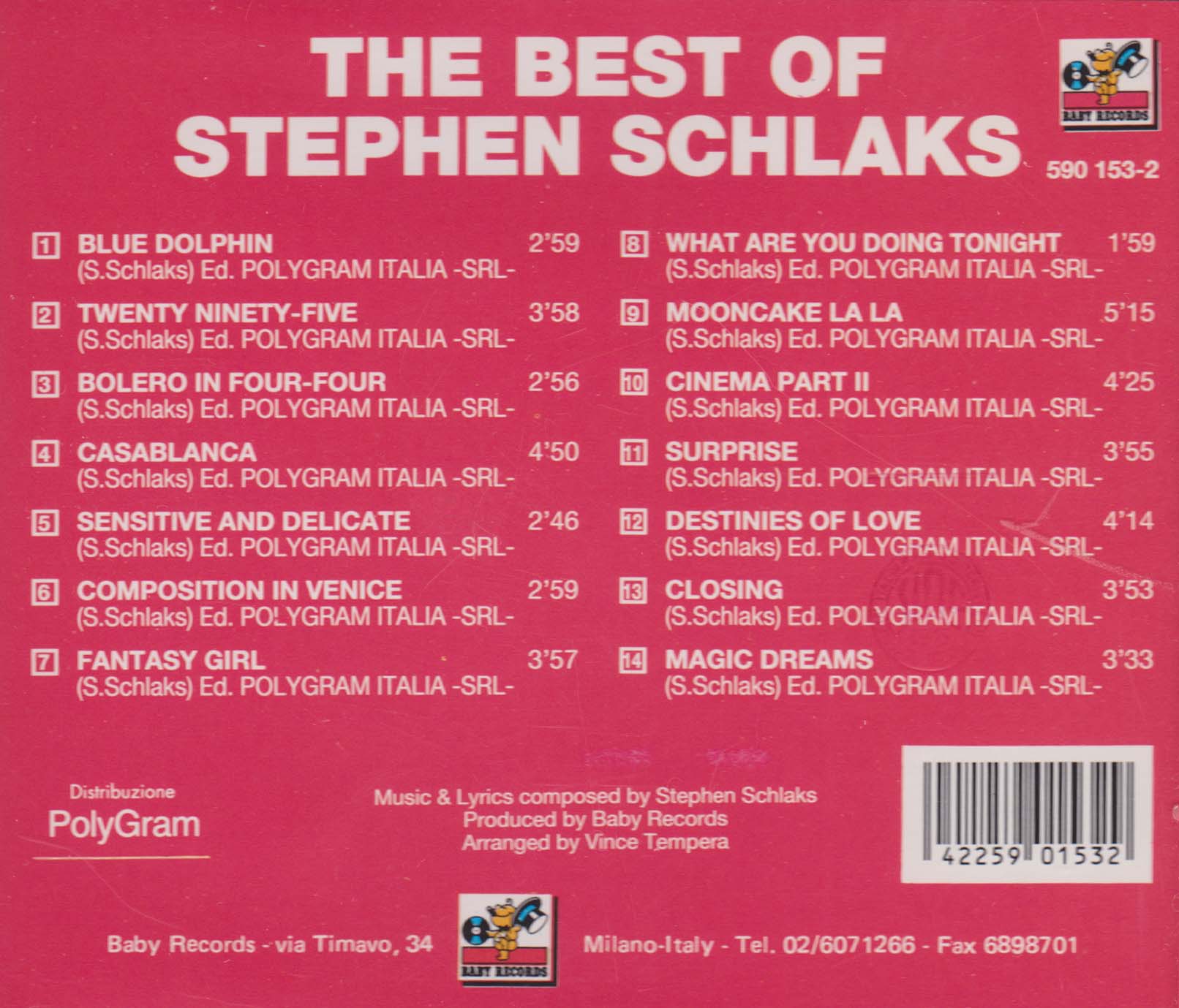 | 391 | STEPHEN SCHLAKS | 196 | THE BEST OF STEPHEN SCHLAKS | 391.jpg | 391R.jpg | BABY RECORDS | 1992 | originale |