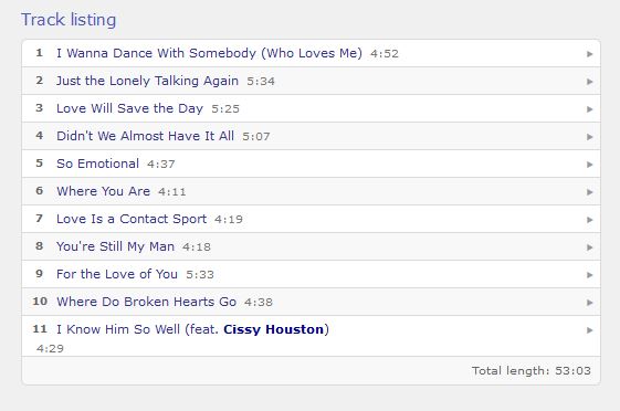 | 524 | WHITNEY HOUSTON | 262 | LOVE WHITNEY HOUSTON | 524.jpg | 524R.jpg | ARISTA | 2001 | |