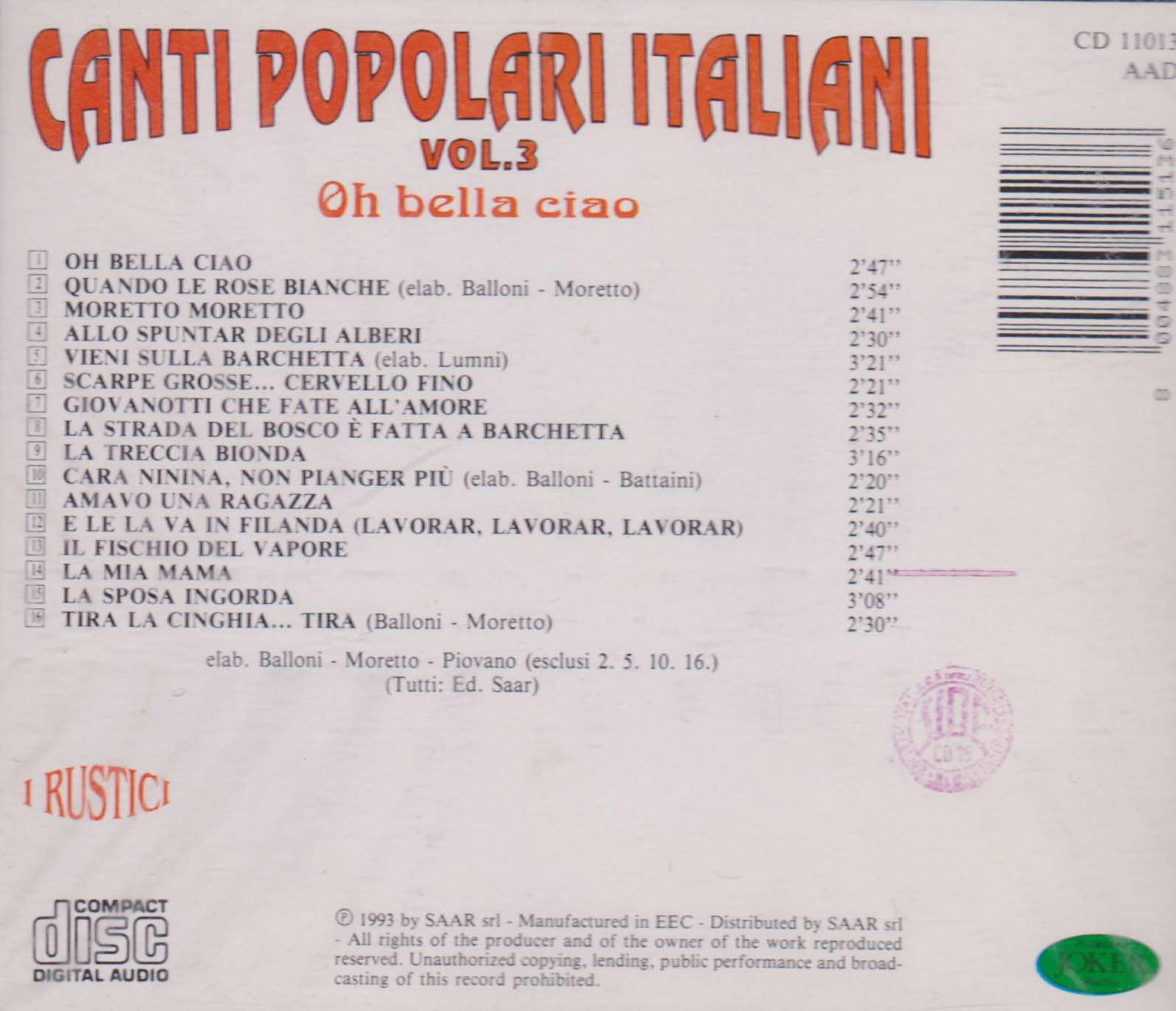 | 462 | CANTI POPOLARI ITALIANI | 231 | OH BELLA CIAO VOL 3 | 462.jpg | 462R.jpg | FOLKLORE JOKER BALLO | 1993 | originale |