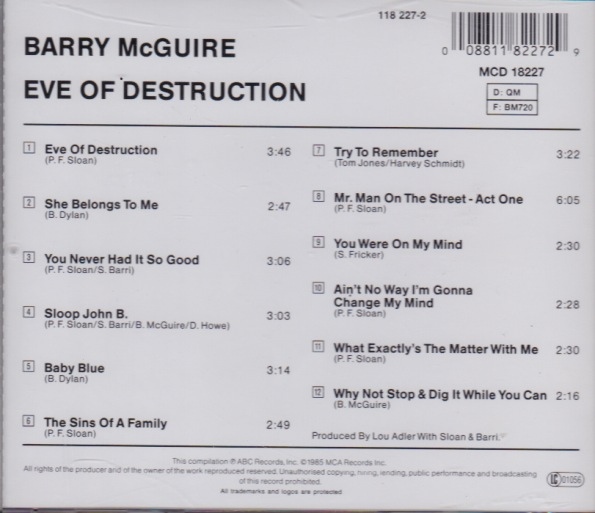 | 507 | BARRY McGUIRE | 254 | EVE OF DESTRUCTION | 507.jpg | 507R.jpg | MCA RECORDS | 1991 | originale |