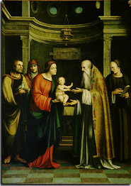 La scena è dominata dall'incontro tra Maria e Simeone, il vecchio sacerdote del Tempio che riconobbe nel Bambino il Messia. Attorno alle due figure, poste al centro dell'equilibratissima composizione, ruota tutta la sacra rappresentazione ritmata sulla sinistra dalle figure di san Giuseppe che porta al Tempio due tortore, e della profetessa Anna e a destra da un anonimo personaggio, forse uno scriba, dietro cui potrebbe celarsi un personaggio reale a noi sconosciuto. La composizione ha per sfondo la nicchia rinascimentale decorata da eleganti fregi. Sulla parete di fondo una scritta in ebraico tratta dal salmo 89. Sul paliotto dell'altare è dipinto un bassorilievo con il sacrificio di Abramo. Su uno dei gradini dell'altare è apposta la firma del pittore: Francia Aurifex Bon F. La tavola del Francia è inserita in un'ancona coeva che racchiude, in basso, in un piccolo tondo, un Ecce Homo, probabilmente opera dello stesso Francia. La lunetta invece apparteneva all'altare di san Mauro ove, in origine era posta una tavola di Girolamo Marchesi. La critica ha sempre considerato l'opera degli ultimi anni dell'artista anche se i documenti ad essa collegati farebbero presupporre un'esecuzione entro il primo decennio del XVI secolo. Probabilmente non molto tempo dopo il trasferimento del committente Giovambattista Bertuzzolli a Fano. Il committente dell'opera fu nominato vescovo di Fano nel 1505 e pertanto l'opera dovrebbe essere stata ordinata al pittore bolognese entro quell'anno e magari eseguita qualche tempo dopo. La figura della Vergine potrebbe far pensare ad un'opera vicina agli affreschi dell'oratorio di Santa Cecilia a Bologna. La pacata e perfetta simmetria dell'abside, l'appiombo centrale della lampada, la perfetta simmetria delle paraste laterali con la loro particolare luminosità che si affievolisce lungo i lati, sembrano ricordare anche esperienze venete Antonelliane contrapposte alle solarità di Perugino. Il confronto con un'altra Presentazione al Tempio, sempre custodita nell'Abbazia e ed eseguita da Francesco Menzocchi, consente di osservare il passaggio, in pittura, dal "classicismo" alla "maniera". La pala venne sequestrata all'Abbazia a seguito delle soppressioni napoleoniche. |