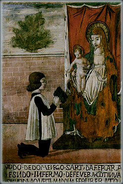 Un uomo è raffigurato in ginocchio davanti alla Vergine che siede sopra un trono con il Bambino in piedi sulle sue gambe. Il trono è posto all’interno di una corte aperta, delimitata sul fondo da un muro di cinta ed il trono è ricoperto da un drappo rosso che costituisce anche l’alto postergale. L’uomo in ginocchio indossa una corta tunica e tiene il tocco nero in mano.