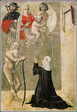 All'interno di una stanza della quale si vedono due pareti, una giovane monaca è raffigurata in ginocchio e a mani giunte. Indossa la tonaca e lo scapolare ed ha il capo coperto da un velo bianco con soggolo plissettato. Davanti a lei un vecchio nudo appoggiato ad un bastone con lunghi capelli bianchi come la barba. In alto a destra una finestra con le imposte aperte. Al centro, entro un ovale, la Madonna con il Bambino che si sporge verso la monaca, fiancheggiata dai santi Rocco e Sebastiano. Di sicuro interesse e di difficile interpretazione il soggetto di questo "voto" offerto da una giovane monaca il cui velo bianco può far pensare ad una novizia. Novelli e Massaccesi avanzano l'ipotesi che il vecchio impersoni una tentazione a cui la suora risponde con la preghiera. Il dipinto rivela indubbie qualità e la presenza dei Santi Rocco e Sebastiano potrebbe orientare la ricerca anche verso guarigione da malattia epidemica. L’organizzata composizione all’interno di una stanza, la presenza della finestra, l’iconografia mariana infine, con il Bambino seduto sulle ginocchia della Madre che viene incontro all’offerente, consentono di collocare il dipinto nella seconda metà del XVI secolo.