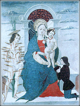 Il penitente è raffigurato in ginocchio ai piedi della Vergine, sul lato destro della composizione. La Madonna, al centro del dipinto, è seduta sopra un trono di marmo con alto postergale concavo. Il Bambino in piedi e nudo, porta al collo e al braccio una collana e un bracciale di corallo. A sinistra, in piedi, S. Sebastiano legato al palo e crivellato di frecce. Novelli (1959) attribuisce la tavola a scuola ferrarese romagnola della seconda metà del XV secolo come denotano i cirri filiformi del cielo simili a quelli che decorano la tavola dello Scaletti a Faenza. Nota inoltre che in alcune parti, lì dove il colore è caduto, si intravedono altri colori di una precedente pittura. K. Rettenbeck, che riproduce il dipinto, prova a datarlo intorno al 1480. L’opera è stata esposta alla mostra di Venezia nel 1942.