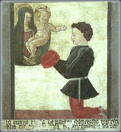 Il giovane maniscalco è raffigurato in ginocchio e in atteggiamento di preghiera. Le mani sono coperte dal cappello rosso. Indossa una corta e ricca tunica stretta ai fianchi da una cintura, calzoni rossi e scarpe chiare intonate con la cintura. La Madonna con il Bambino appare in alto a sinistra, a mezzo busto. Si tratta di un dipinto di notevole interesse databile nel decennio 1460 - 1470. Il taglio netto dell’occhio e la linea di contorno che delimita la figura dell’offerente consentono di accostare il dipinto al gruppo cui fa capo l’opera che riproduce san Sebastiano e giovane offerente, anche se, in questo caso, la realizzazione sembra meno precisa soprattutto nell’immagine della Vergine. Iconograficamente rilevante la raffigurazione del Bambino che viene incontro all’offerente, superando la barriera tra il divino e l’umano. La Madonna raffigurata a mezzo busto, caratterizzerà l’iconografia mariana di questa raccolta fino alla seconda metà del secolo XVI.