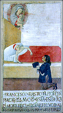 Francesco Fiastro giace in un letto, a torso nudo, ed ha il capo ricoperto da una cuffia rossa. Il letto è delimitato superiormente da un alto postergale in legno alla cui sommità, quasi un capezzale, appare la Madonna con il Bambino in braccio "offerto" alla venerazione dei presenti. L’uomo è ricoperto con una coltre rossa e poggia il capo su un cuscino a sacco rivestito con una federa bianca come le lenzuola visibili sotto la coltre rossa. Ai piedi del letto un altro uomo, in ginocchio, indossa una corta tunica, aperta sui fianchi e priva di cintura.