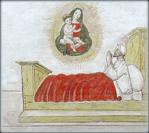 In una stanza disadorna, un uomo è seduto sopra il letto con le mani giunte in atteggiamento di supplice preghiera. Indossa una lunga camicia bianca e un copricapo anch’esso bianco. Si appoggia ad un cuscino addossato all’alto postergale di legno del letto ed ha il corpo ricoperto da un panno rosso dal quale emerge il risvolto del lenzuolo bianco. Il letto poggia sopra un suppedaneo e si evidenziano i chiodi che ne fissano le due estremità. Al centro del letto, in alto, è raffigurata la Madonna con il Bambino verso la quale il penitente leva la sua preghiera. La Madonna indossa una veste rossa e la tunica è di colore verde. Il fanciullo, tra le sue braccia, tiene con la mano sinistra il bordo del mantello.