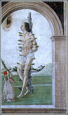 La composizione è inscritta entro un arco a pieno centro in pietra a vista perfettamente squadrata. Al centro, legato ad un tronco, è raffigurato san Sebastiano con il corpo crivellato da numerose frecce, visto di tre quarti, leggermente girato verso sinistra e con lo sguardo rivolto in alto. Sul bordo superiore appare, entro una raggiera dorata, una piccola immagine della Madonna con il Bambino. Ai suoi piedi, in ginocchio, una fanciulla con i capelli raccolti da un nastro e coperti da una cuffietta rossa, rivolge la sua preghiera al Santo. Questa figura è vista di spalle, perfettamente scorciata in profondità e i volumi sono accentuati dal sapiente gioco dei colori. Il santo campeggia sopra un paesaggio caratterizzato da colline decrescenti che si aprono, sul fondo, in una vegetazione più fitta e articolata. Il dipinto è tra i più significativi e anche problematici dell’intero complesso votivo.