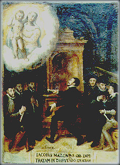 All'interno di un'aula siedono su delle panche, sei dottori. Indossano la toga e il cappello in testa. Tengono in mano dei libri. Al centro dell'aula, davanti ad una cattedra con alto postergale, un uomo con lo sguardo rivolto verso il cielo, è raffigurato in atto di genuflettersi. A sinistra, in alto, appare la Madonna con il Bambino in piedi sopra la nuvola cornice che delimita un fondo dorato. Massaccesi - .Novelli identificano la "disputa" con quella che vide artefice il cesenate Mazzoni e l'Università di Bologna, nel 1577. Osserviamo la composizione che raffigura il momento successivo alla disputa, quando superato il severo esame, i dottori tacciono e discutono ormai tra di loro, mentre Mazzoni si avvia verso la cattedra sulla quale sederà. Prima di insediarsi il suo sguardo si leva in alto verso la Madonna, in un gesto di ringraziamento.