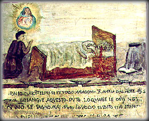 Un ragazzo giace riverso in un lettino con spalliere in legno, inferiormente sagomata. Dalla bocca perde tanto sangue. Un uomo è in ginocchio ai piedi del letto. In alto appare la Vergine. Il dipinto è del tutto rovinato, si evidenziano vasti rifacimenti ed è stata ricostruita pressoché integralmente l'immagine mariana. Particolare interesse riveste l'iscrizione che il restauro ha consentito di meglio leggere rispetto alla trascrizione data dal Novelli - Massaccesi, recuperando la data. Non è chiara la terza cifra, ma è ben visibile il 4 che orienta indiscutibilmente verso il XV secolo. La semplicità d’esecuzione e le vaste ridipinture non consentono alcun confronto.