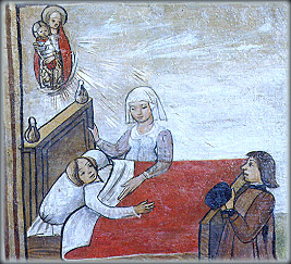 Un bambino è raffigurato in un letto assistito dalla madre o, più probabilmente, da una fantesca. Ai piedi del letto un uomo in ginocchio con il cappello in mano. In alto, sopra il letto, è dipinta la Madonna con il Bambino in braccio stretto in bianche fasce. La tipologia quattrocentesca del letto con il montante superiore molto alto rispetto al terminale è appena ingentilita dai due pomelli decorativi sulla testata. Osserviamo la piega e il risvolto bianco del lenzuolo nonché la posizione dell'uomo in ginocchio che trovano riscontro nel dipinto n. 27. Vi sono molti punti di riferimento tra le due opere compreso il colore bianco della parete di fondo, qui maggiormente rovinato per i numerosi successivi ritocchi ad olio che hanno finito per ricoprire l'originaria tempera. Il confronto non ci autorizza comunque ad ipotizzare uno stesso autore anche perché quest'opera si caratterizza per alcuni originali tratti figurativi e per la caratteristica linea nera con cui vengono sottolineati i contorni delle figure e degli oggetti. Particolarmente interessante la giovane figura femminile accanto al letto, forse una fantesca. Pensiamo infatti che se si trattasse della mamma, il suo atteggiamento sarebbe stato quello dell'orante. Il Bambino Gesù, ricoperto da strette fasce, è un elemento compositivo che appartiene ancora al XV secolo.