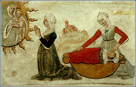 Una fantesca e la madre sono raffigurate accanto ad una culla ove giace un fanciullo. La fantesca, che indossa abiti dai colori vivaci, cerca di accudire il piccolo, raffigurato esanime ricoperto da una coltre rossa. L’altra donna, quasi certamente la Madre, è dipinta di profilo, in ginocchio, con le mani giunte. Sul fondo, sopra un monte, il santuario mariano. In alto a sinistra appare la Vergine entro una cornice con raggi serpentinati. Gli abiti delle due donne consentono di datare l’opera ancora nei primi anni del XVI secolo. Il modo di allacciare la veste della fantesca, la caratteristica manica aperta lateralmente sulla sottostante camicia e le fitte pieghe centrali, caratterizzano un costume che trova riscontro nelle corti rinascimentali padane. Notiamo l’interessante cornice che circonda l’immagine della Vergine che, in questo caso, più che raffigurare i raggi metafisici fa pensare ad una cornice reale. La particolare raggiera entro cui è posta l’immagine mariana sembrerebbe imitare il simbolo di san Bernardino.