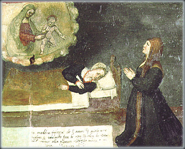 Una donna giace riversa in un letto. Indossa abiti eleganti. Ha i capelli tenuti raccolti da un copricapo ricamato e il collo adorno di una collana di corallo. A fianco del letto un'altra donna, in ginocchio e a mani giunte, indossa un lungo abito ed ha il capo coperto da un elegante velo che scende gił fino a terra. In alto appare la Madonna con il Bambino delimitata da una nuvola cornice.